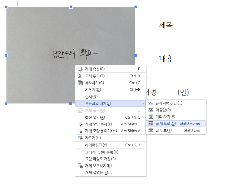 - 한글 파일에 서명을 첨부하고, [글 앞으로] 속성 지정해놓기