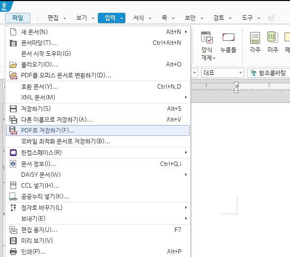 한글 프로그램은 PDF로 저장을 지원하고 있으며, 아래의 사진과 같이 [파일] - [PDF로 저장하기] 메뉴를 통해 문서를 PDF로 저장하실 수 있습니다.