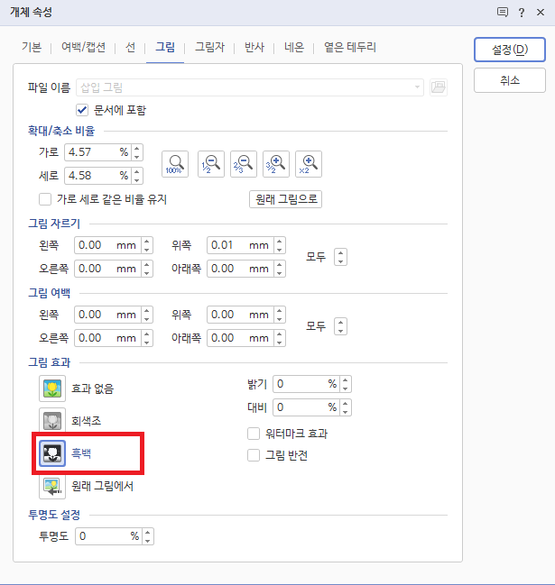 - [개체속성] - [그림] - [그림 효과] - [흑백] 효과 지정하기