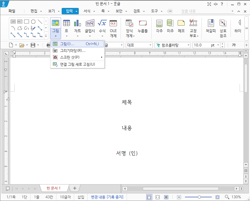 상단 도구 모음의 [입력] - [그림] 탭을 이용해 서명을 문서에 첨부합니다.