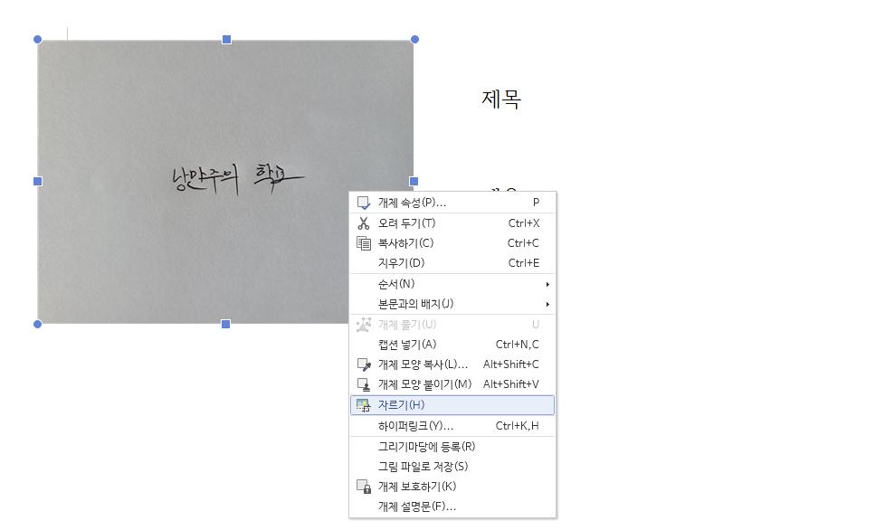서명 사진을 마우스 우클릭 - [자르기]를 활용해 최대한 서명을 제외한 여백을 잘라냅니다. 사진을 클릭하고 시프트(Shift)를 누른 상태로 크기를 조절하면 마찬가지로 그림을 자를 수 있습니다.