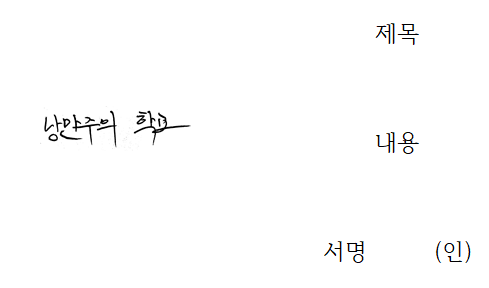 마지막으로 서명을 (인) 위에 적절히 겹쳐 옮긴 후, 위에서 했던 것처럼 마우스 우클릭 - [본문과의 배치] - [글 뒤로]를 선택하면 자연스럽게 서명이 첨부됩니다.